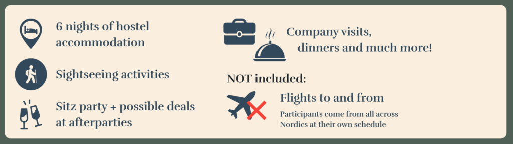 The core structure of NESU Excursion includes your hostel accommodation at the destination for the whole duration of the trip. All group activities are included in the price. There are usually two sightseeing activities we do as a group, and a party on Saturday. The week also includes events with food, company visits and a team competition.